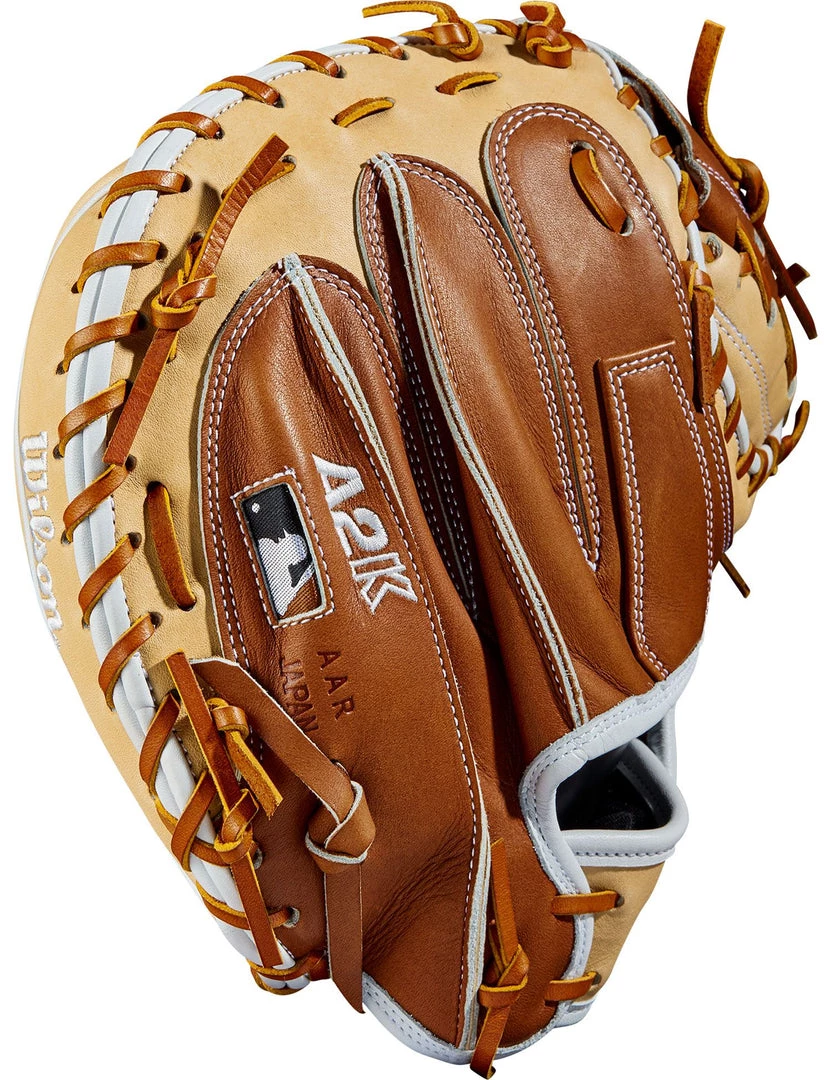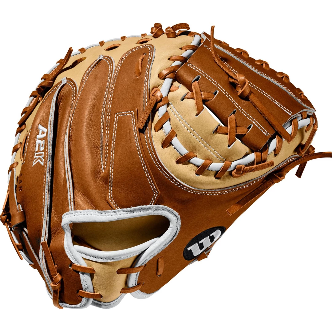 Get to work behind the plate with the A2K® M1. This model has a Half Moon Web and Blonde and Saddle Tan Pro Stock Select Leather in a durable design and Dri-Lex Lining keeps your hand cool on hot afternoon contests.