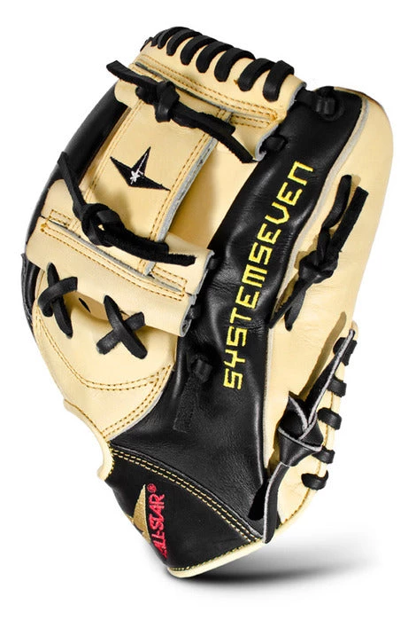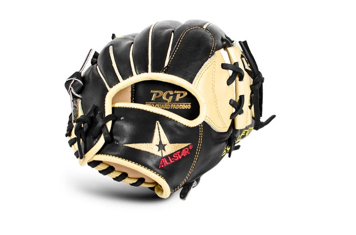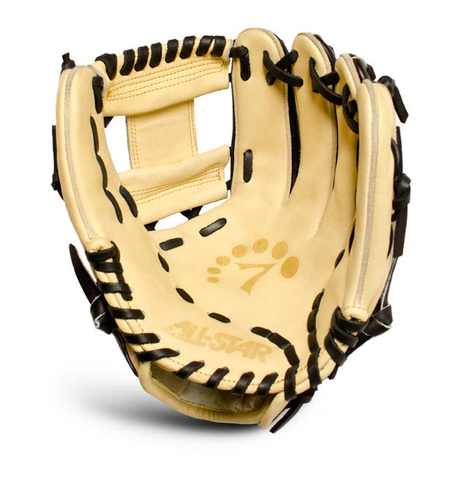 The All-Star System Seven™ FGS7-IFL is an 11.75” pro infielder’s pattern with a shallow pocket for scooping the ball and fast transfers. The two shades of leather were meant to be used together, as each shade has very distinct properties. The softer tan leather on the inside helps develop an amazing pocket and fast break in times, while the black leather on the back gives support for added life. Pro Guard Padding (PGP) in the palm lets you know that you have the ball but helps remove the sting.