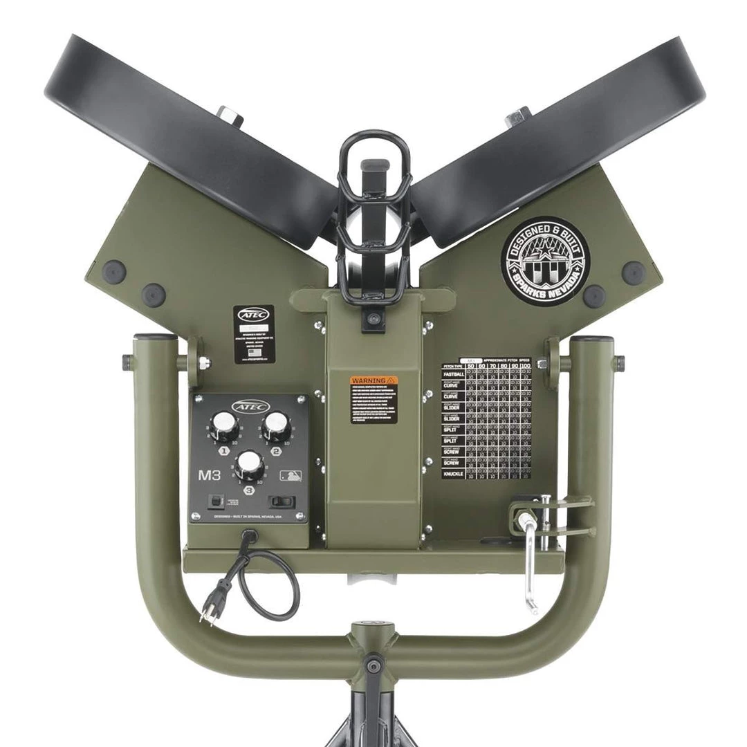 The M3 Offensive Pitching Machine is built to train professional level ball players. Its industry leading 3-wheel design allows for hitters to have complete visibility of the ball throughout the entire pitch cycle, which improves their timing and increases their pitch recognition. By utilizing three wheels, top speed, accuracy, and spin are maximized due to the ball’s increased surface contact with the wheels. The M3 is equipped to throw 105mph giving you the ability to train against Major League level fastballs and both right and left handed breaking balls. Using only the speed control knobs, pitches can easily be dialed-in without making any physical adjustments to the machine, helping you improve the efficiency and effectiveness of your batting practice. The M3 is the Official Machine of Major League Baseball.