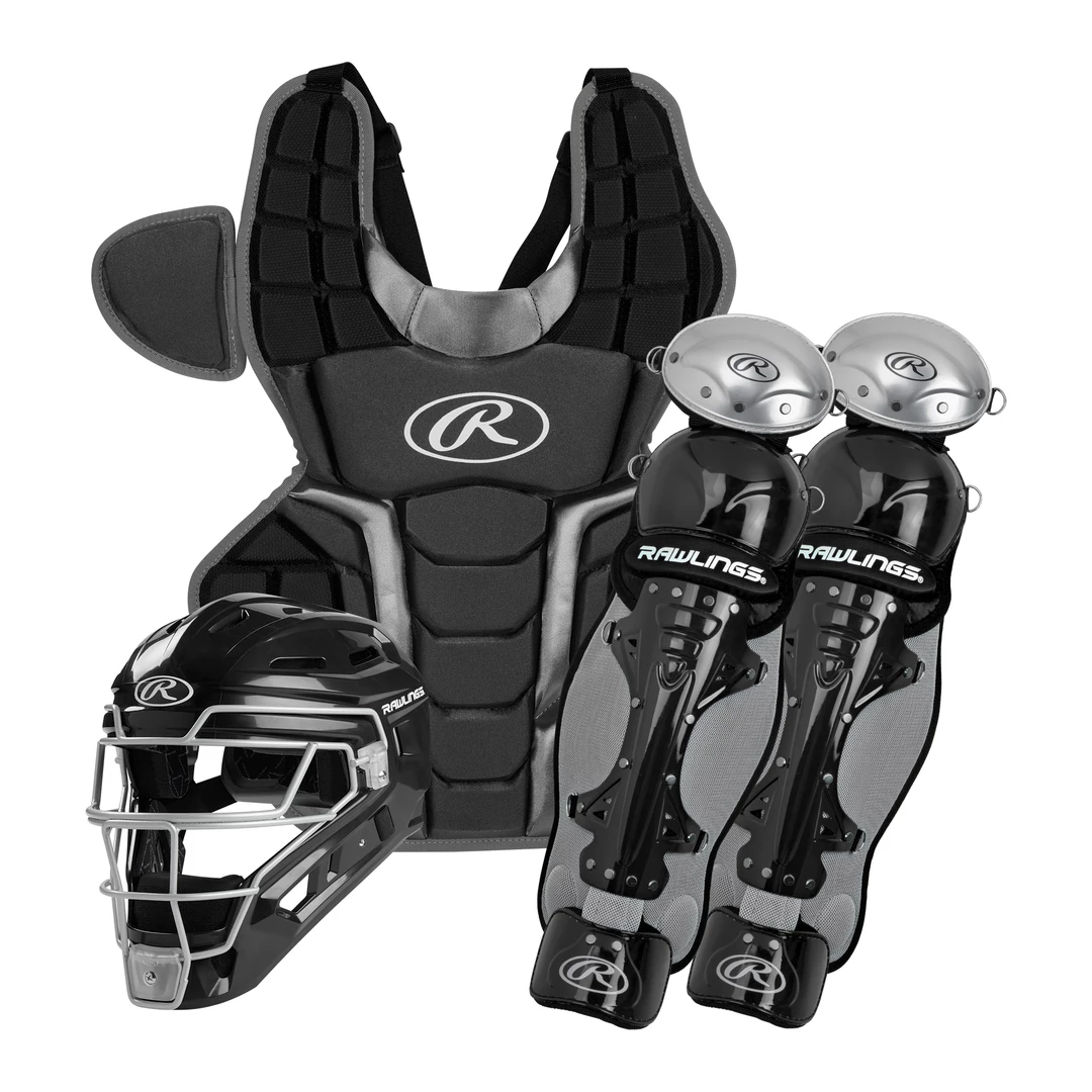 The Rawlings Renegade® 2.0 Series catcher’s set features a Coolflo hockey-style helmet, 14 inch chest protector and 13 in triple-knee leg guards.