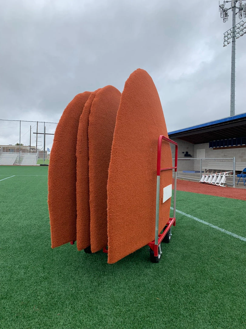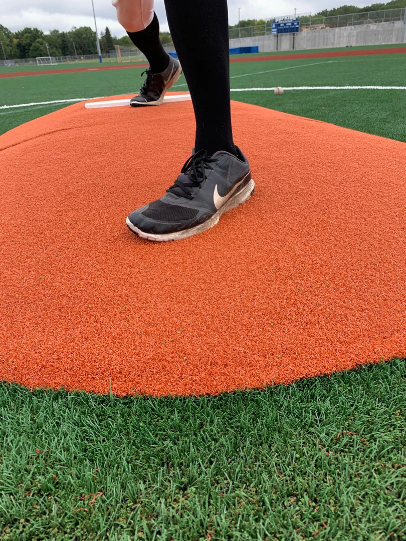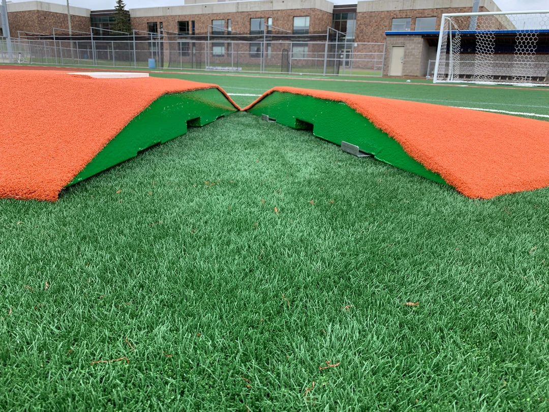 Portolite baseball pitching mounds give the pitcher the feel of a regulation baseball mound, while also allowing field crews the ability to move it with ease. Each baseball pitching mound is designed with a full body, high performance poly protected resilient core with fiberglass reinforcement giving the pitcher a solid, no bounce, yet cushioned baseball mound that reduces knee and ankle strain. Portolite pitching mounds are covered with the highest quality nylon AstroTurf® available in Clay or Green colors. Portolite simulated pitching rubbers last ten times as long and have a hidden wear pad underneath the turf immediately in front of the pitching rubber. Built with gentle slopes and tapered edges to give the pitcher the highest level of comfort. Two Piece Full Length Game Mounds are available in 8” and 10” sizes. .