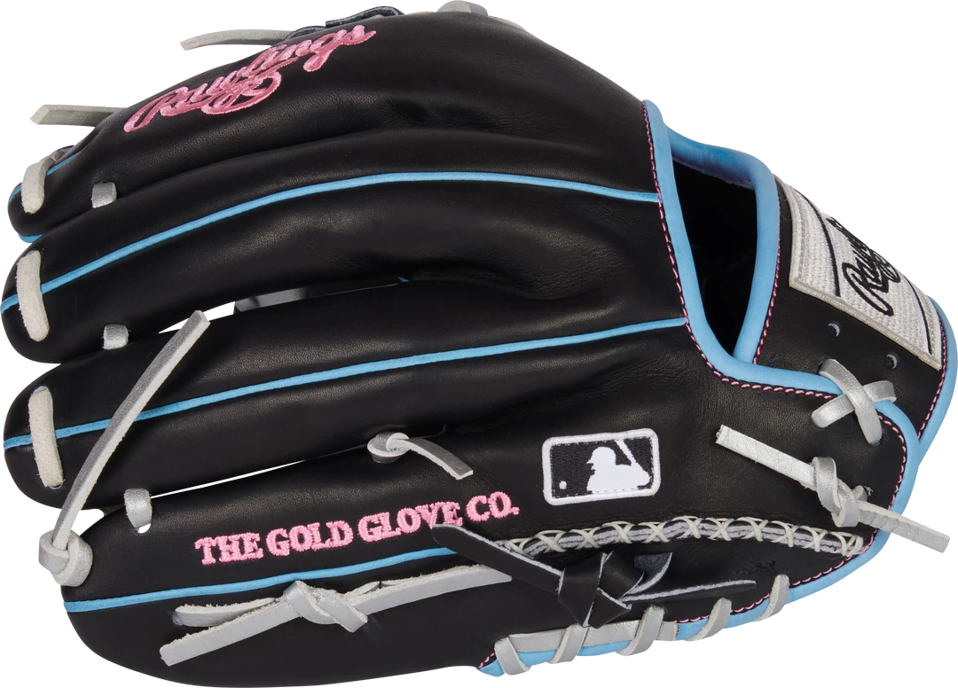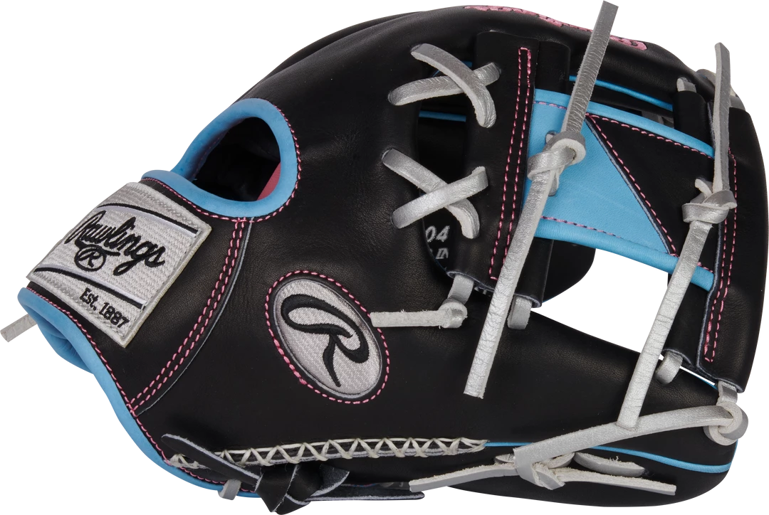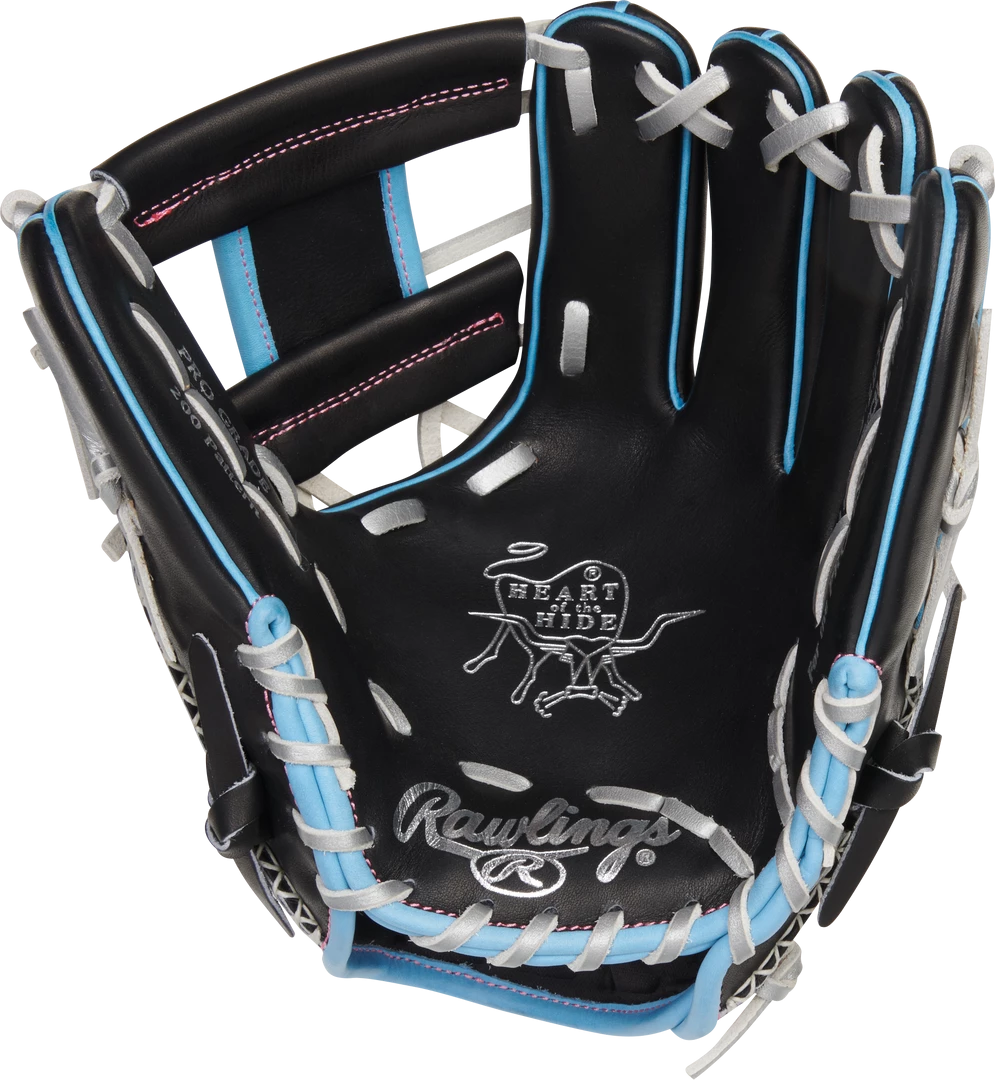 Add some color to your game with the Heart of the Hide ColorSync 6.0 11.5-inch I-web glove. We crafted this gamer from ultra-premium steer-hide leather with an eye-grabbing black design with Columbia Blue accents. On top of that, the platinum laces give this glove an extra design spark that stands out from the crowd. This glove was built with a pink deer-tanned cowhide palm lining, thermoformed wrist lining, a padded thumb sleeve for unmatched comfort and feel. Also, the hand-sewn welting adds extra style and durability, it’s all tied together by the ultra-rare Rawlings ColorSync patch. All together, this Heart of the Hide infield glove gives you pro-level performance with an eye-catching three-tone design. Its Pro 200-pattern is one of our most popular infield patterns of MLB players thanks to it’s deep, wide pocket. The I-Web and unique colorway stand out when you flash leather anywhere on the diamond. Don’t miss out on this limited edition HOH ColorSync 6.0 I-web glove — order yours now before it’s gone for good!